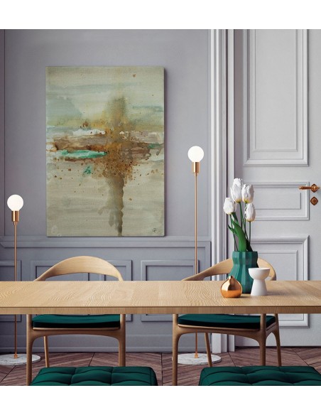 An abstract painting in earth tones with touches of turquoise and mustard, reminiscent of the formation of a precious stone. Design by Marta Castet Bellocq