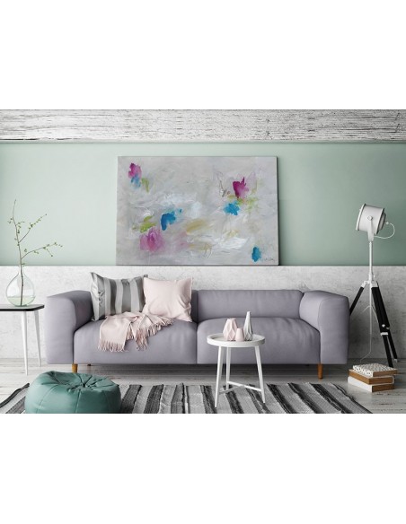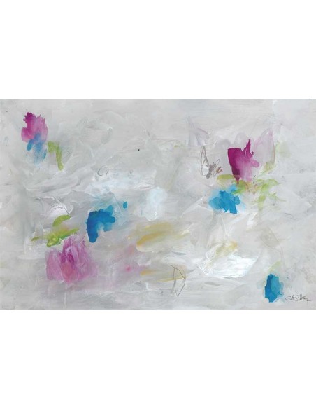 Sand painting of floral silhouettes on a wide grayish background. Reproduction of the painting by Marta Castet Bellocq