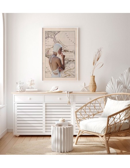 Poster of a woman in profile with swimwear with the map in the background. An ideal painting for bohemians.