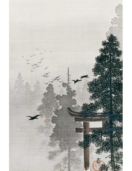 Forest landscape with flock of birds in the sky
