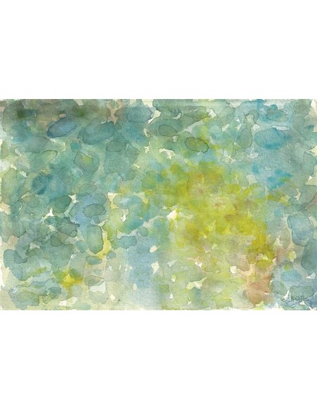 Diseño abstracto de manchas imperfectas donde se intuyen flores en verde y amarillo. Reproducción de la obra de Marta Castet Bellocq