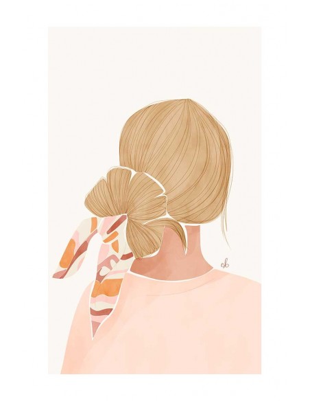 Illustration of a girl from behind, where the details of the knotted scarf stand out. An original design by artist Chloé Lamothe.