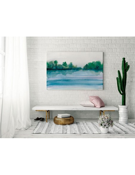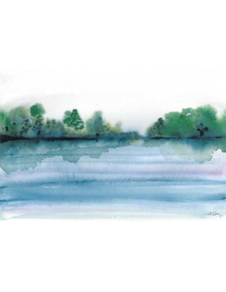 Green forest reflected on the blue waters. Reproduction of the work of Marta Castet Bellocq