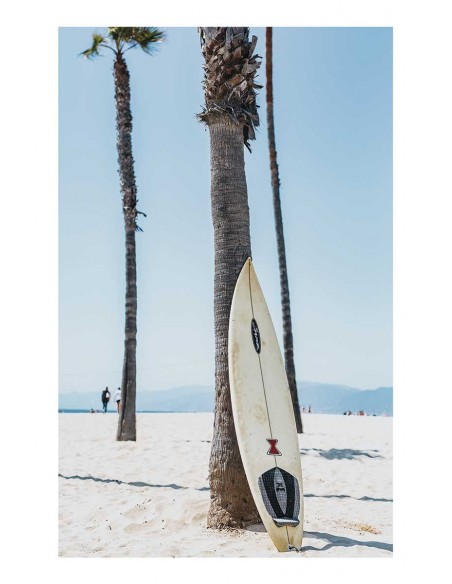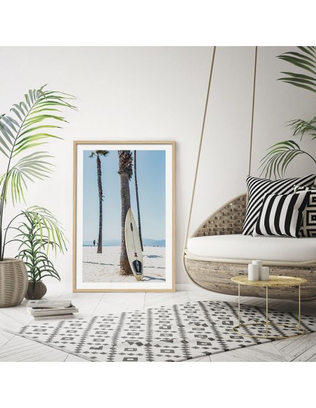 Palm trees, a surfboard, the sand and the sea in the background. A juicy combination for sports and beach lovers.