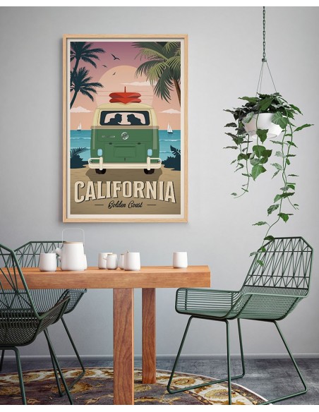 Vntage van in green color off the Californian coast. A poster designed by Travel Studio for adventure lovers