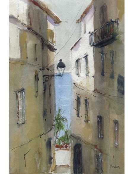 View of a street in Mugardos with the sea in the background, reproduction of the work by Nacha Cassinello