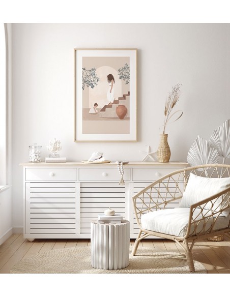 A tender illustration full of details, in which a young girl and a baby are represented. A work in natural tones, a trend that is here to stay. Reproduction of the work of Christine Kapa.