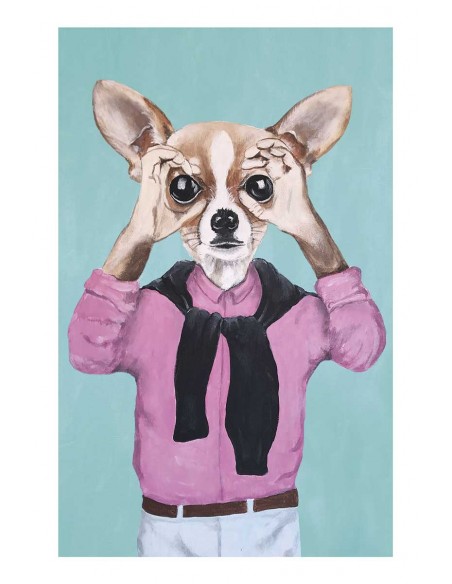 Design of a Chihuahua dog dressed in a pink shirt staring. A fun painting for animal lovers