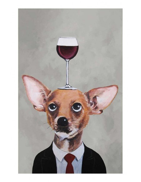 Chihuahua Dog design dressed in a suit and a glass of wine on his head. Reproduction of the original work of Coco de Paris