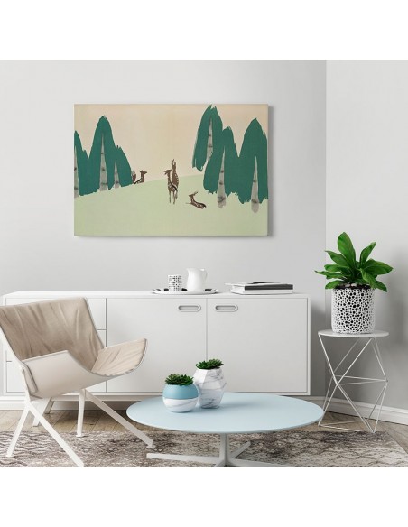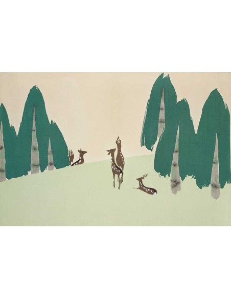 Countryside landscape in green color with deer among the trees