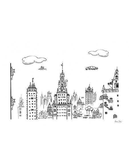 Silhouette of a black and white urban landscape made by the artist Aurora Rumí.