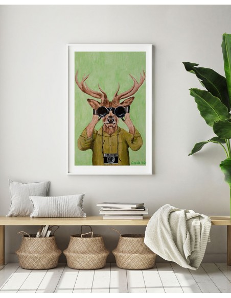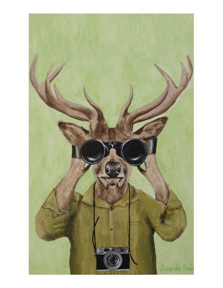 Deer design with green shirt looking through binoculars. Reproduction of the original image created by Coco de Paris.