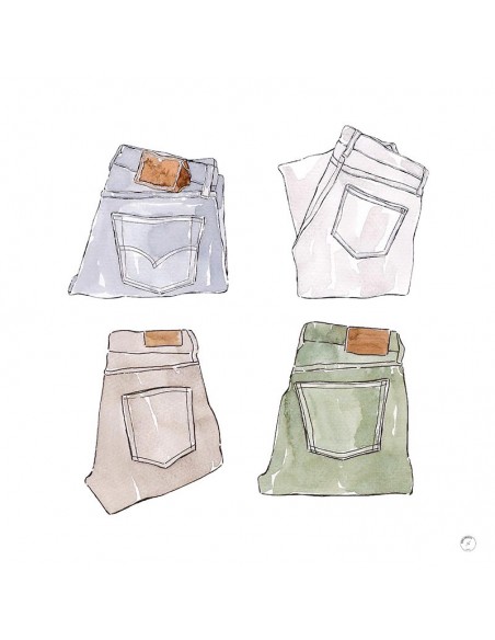 Composition of four denim pants in various colors. Ideal for fashion lovers. Reproduction of Valeria Rienzi's design