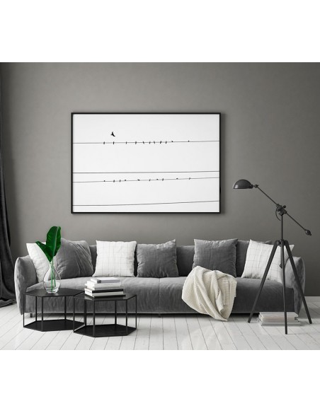 Photograph of some birds resting on a set of cables in a minimalist style.
