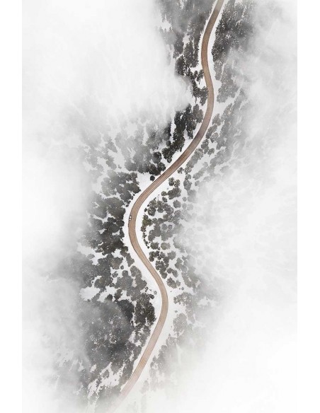 A bird's eye view of a road winding through a snowy forest. Choose the size and finish that you like best for this beautiful photograph.