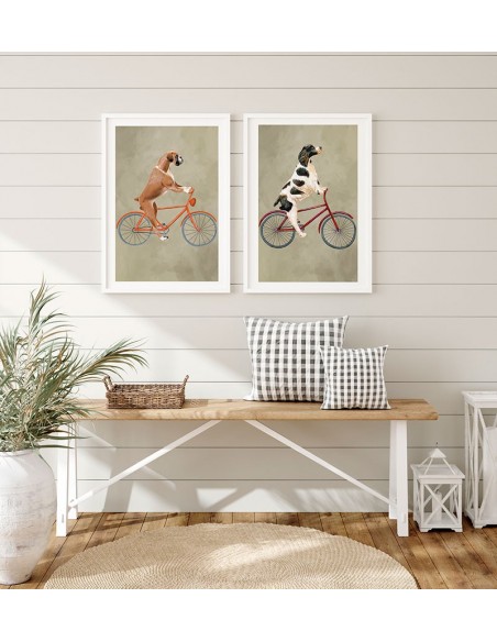 Image of Springer dog riding a red bicycle. Reproduction of the Coco de Paris design for dog lovers.