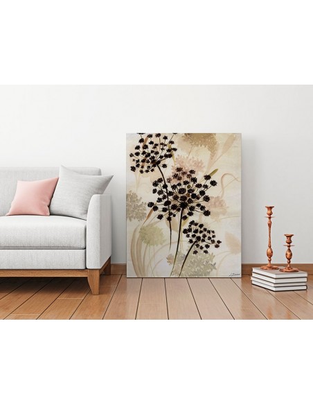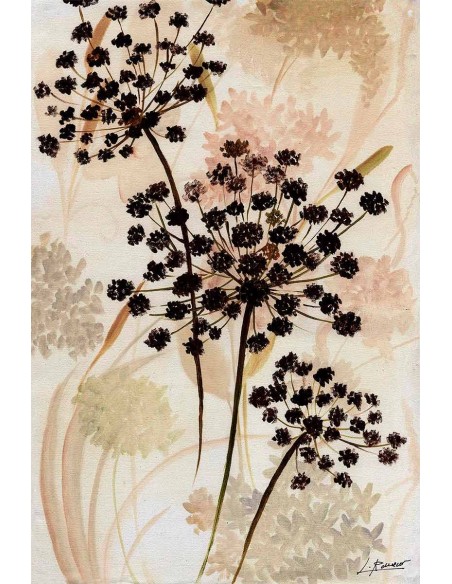 Black flowers on ocher background. Reproduction of the work of Luisa Romero