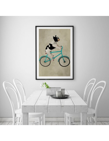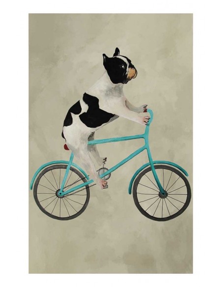 Picture of a bulldog dog riding a turquoise bicycle. Reproduction of Coco de Paris design