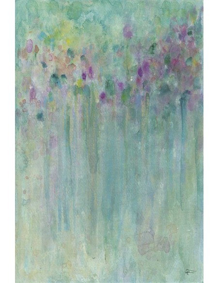 Abstract in turquoise where small pink flowers can be glimpsed. Artist: Marta Castet Bellocq