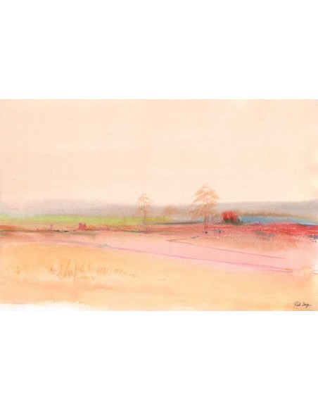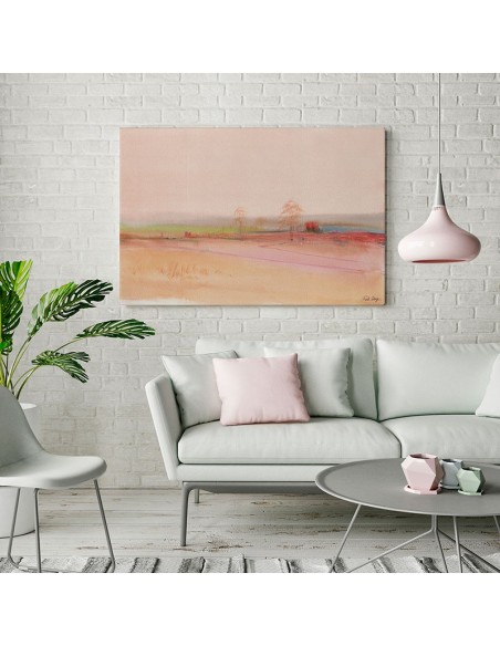 Idyllic countryside landscape in coral tone. Reproduction of the work of Ruth Design