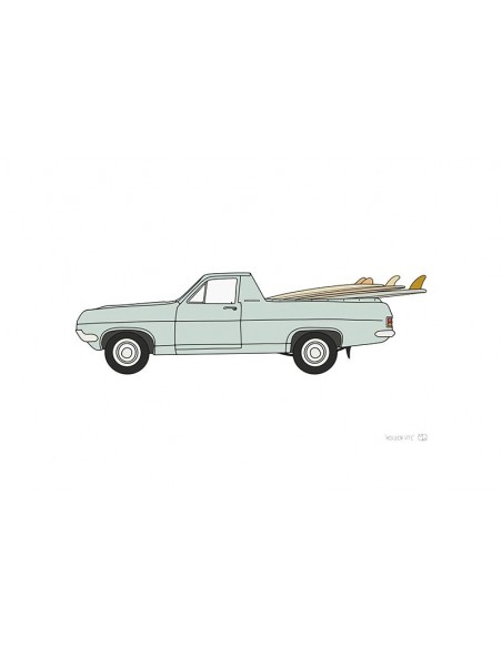 An illustration for lovers of travel and surfing. A retro style car loaded with surfboards. A reproduction of the work of Matthew Wigglesworth.