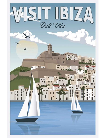Mediterranean landscape in white and blue tone of a cove in Ibiza. A calm and picturesque painting designed by Travel Studio.
