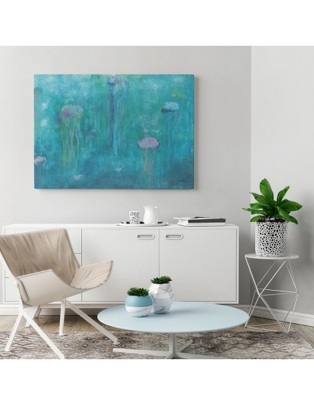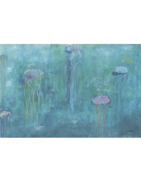 Turquoise seascape with colored jellyfish reproduction of the original design by Marta Castet Bellocq