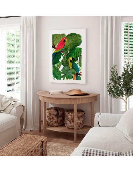 Tropical style painting of large green leaves and two colorful toucans. Original design by Luisa Romero