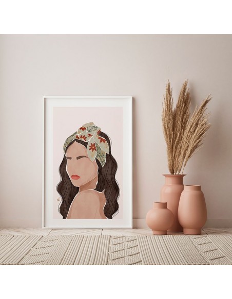 Illustration of a girl with a headscarf. Make a combination with several paintings from the Illustrations Collection to give a different touch to your spaces. An original design by artist Chloé Lamothe.