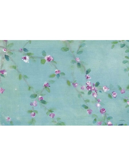 Liberty, delicate branches of pink flowers on a turquoise background, reproduction of the work of Marta Castet Bellocq