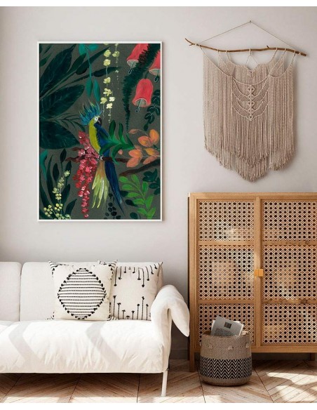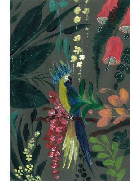 Tropical style painting with a parrot in my foreground, design by Luisa Romero.