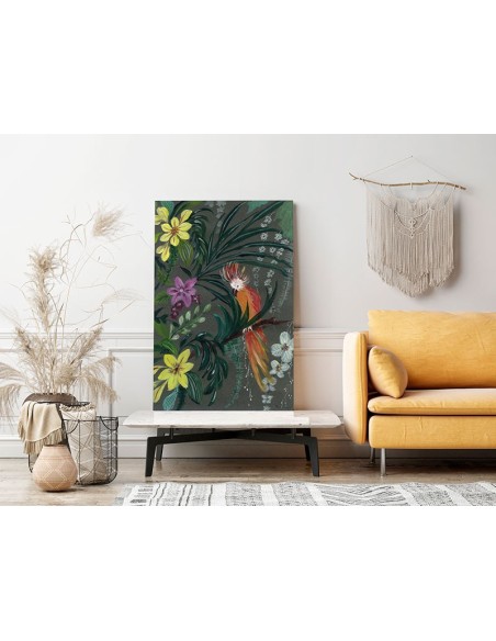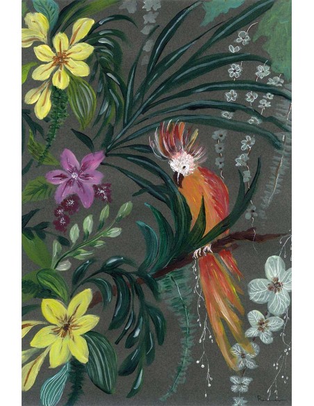 Tropical painting with a parrot in the foreground, designed by Luisa Romero. Green background with yellow flowers