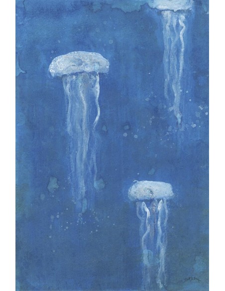 Seabed landscape in blue with white jellyfish floating, reproduction of the work of Marta Castet Bellocq.