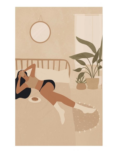 Illustration of an everyday scene: the beginning of a new day with a cup of coffee. A work in natural tones by the artist Diana Mejia.