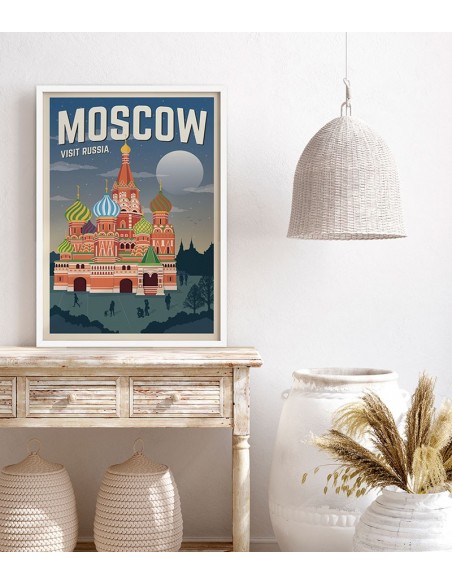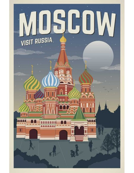 Moscow poster with its colossal multicolored cathedral in the foreground. A cheerful and colorful design that evokes the most exotic places