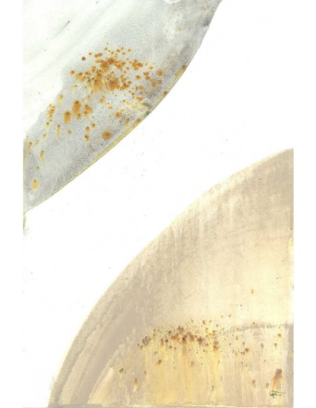 Abstract "Worlds" reproduction of the work of Marta Castet Bellocq in mustard and gray tones.