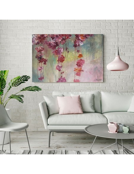 Hanging flowers in pink color on green background. Artist: Luisa Romero