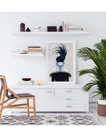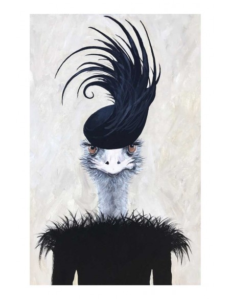 Image of a sophisticated ostrich with a 1920s style feather hat. Elegant and fun. A Coco de Paris design. If you like this painting, you will love its entire collection.