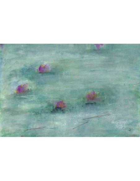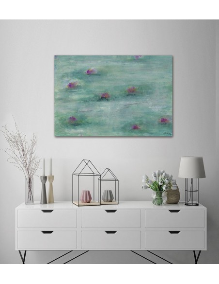 Abstract floral painting where pink flowers can be glimpsed on a turquoise background