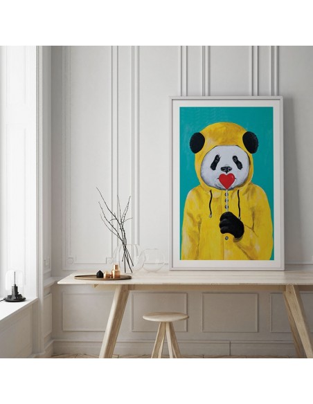 Image of a Panda with a yellow raincoat and a heart-shaped lollipop. A very decorative painting, reproduction of the original design by Coco de Paris