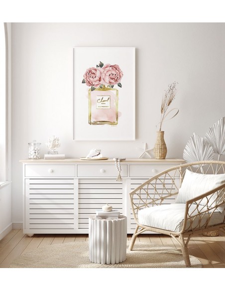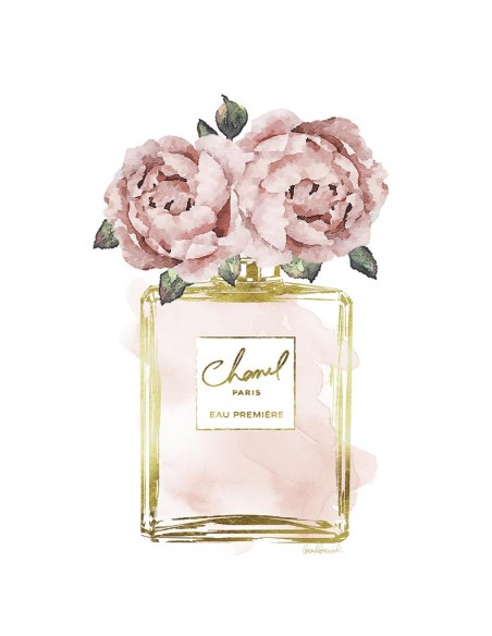Illustration in pink tones of a perfume bottle with pretty flowers. Create the combination that you like the most with the different models of the Fashion Collection. Artwork by Amanda Greenwood.