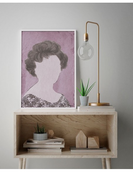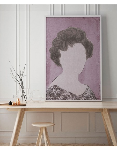 A female portrait in a vintage style, on a lilac background. Reproduction of the work of Bruno Vázquez.