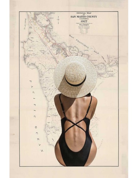 Woman sitting on her back with a hat looking at a map. A picture to get lost on the shores of the Pacific Ocean.