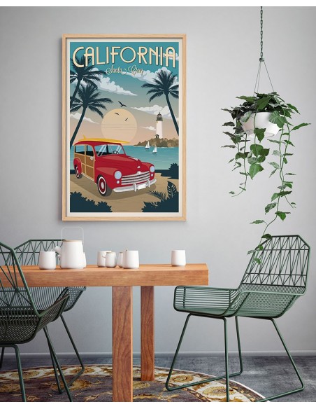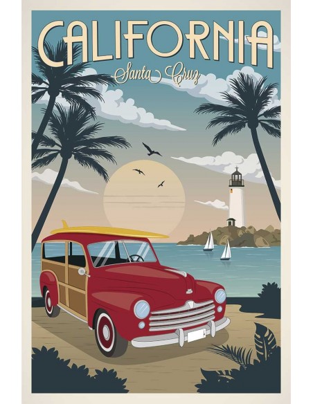 Decorative painting of Santa Cruz, California with a classic red car in the foreground. A painting for the most travellers. If you like this style you will find another one from this same collection