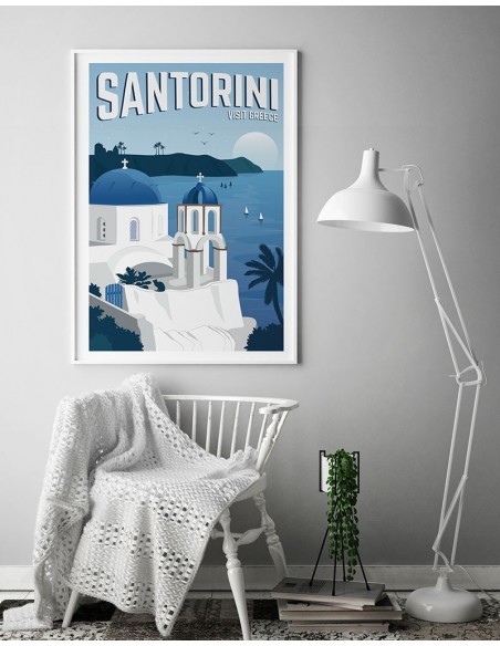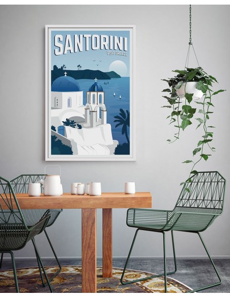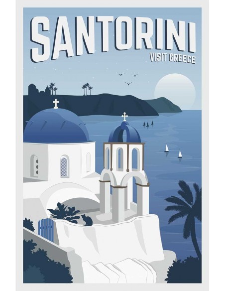 View of Santorini Island in the Aegean Sea. A dream island of white houses perched on the cliff. Design made by Travel Studio.