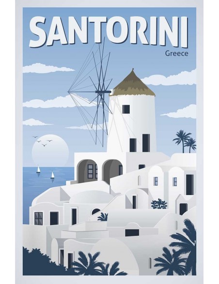 View of Santorini Island in the Aegean Sea. An island in the purest Mediterranean style of white houses hanging on the cliff. Design made by Travel Studio.