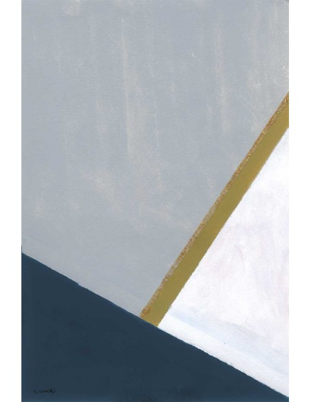 Abstract style painting of different planes in two shades of blue and one plane in white. Sky title. Reproduction of the original work of Elena Camacho.