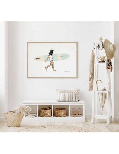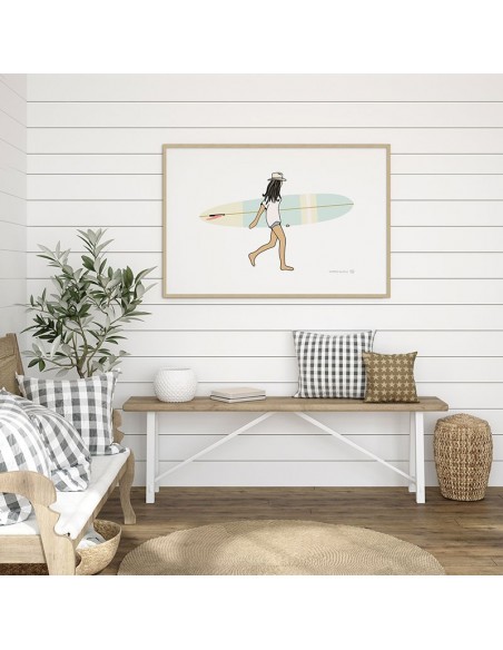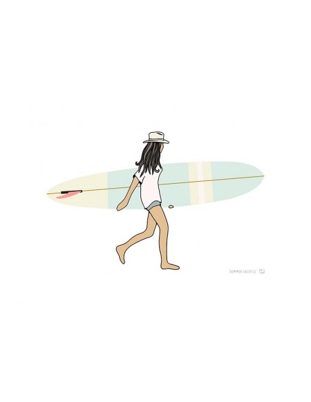 A painting for lovers of outdoor sports. A girl walking around with her colorful surfboard. An illustration by Matthew Wigglesworth.