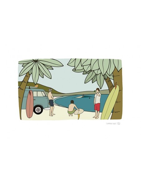 If you like the sun, the sand and the sea you will love our Surf Theme paintings. This illustration captures a group of friends taking a break. A reproduction of the work of Matthew Wigglesworth.