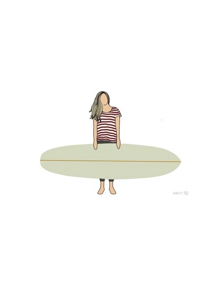 A girl in a striped t-shirt holding her surfboard. Illustration by Matthew Wigglesworth.